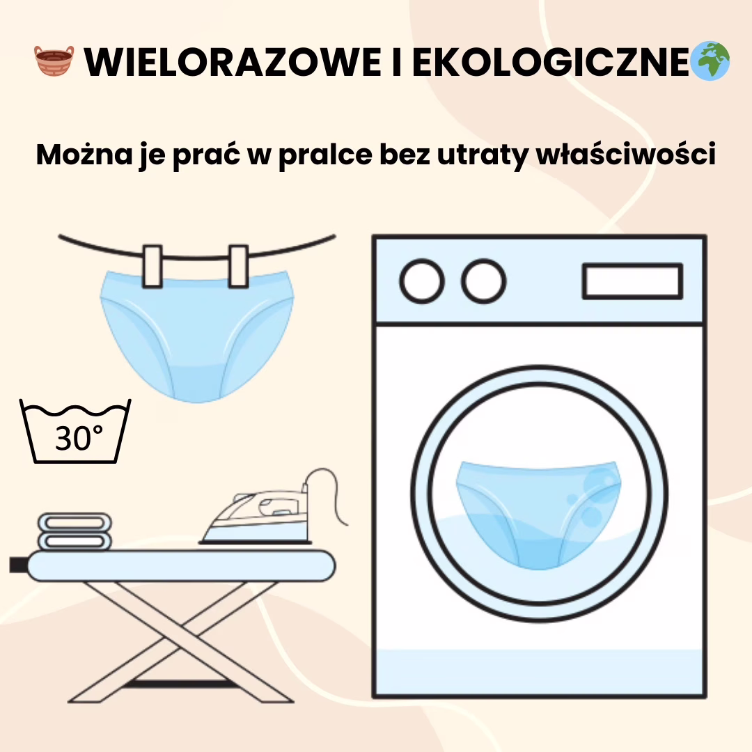 Tak po użyciu należy wypłukać majtki w zimnej wodzie, a następnie prać w pralce w 30°C. Suszyć naturalnie, unikając suszarki, aby zachować ich trwałość.