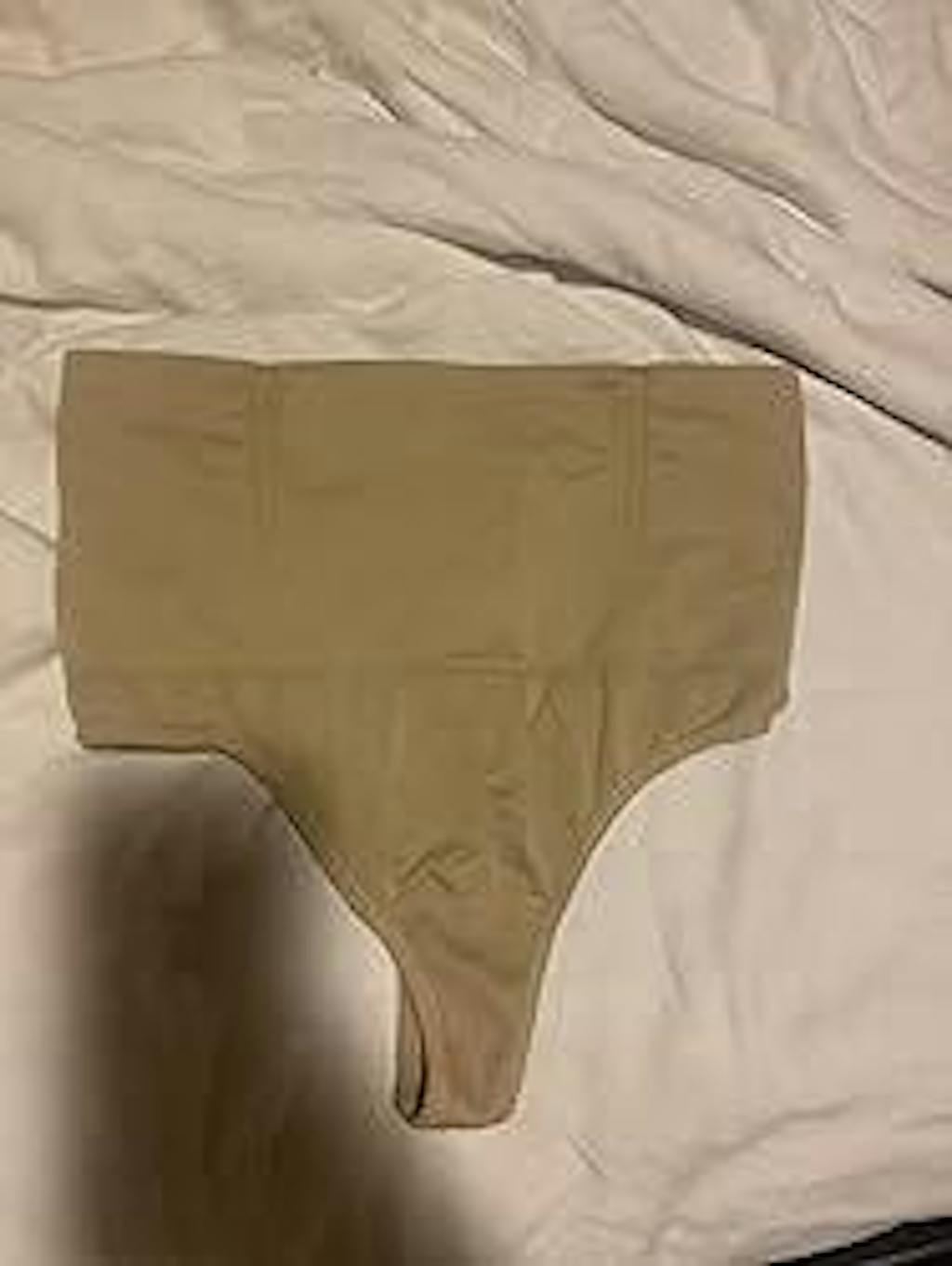 Brzuch wygląda płasko, a majtki są niewidoczne pod ubraniem.